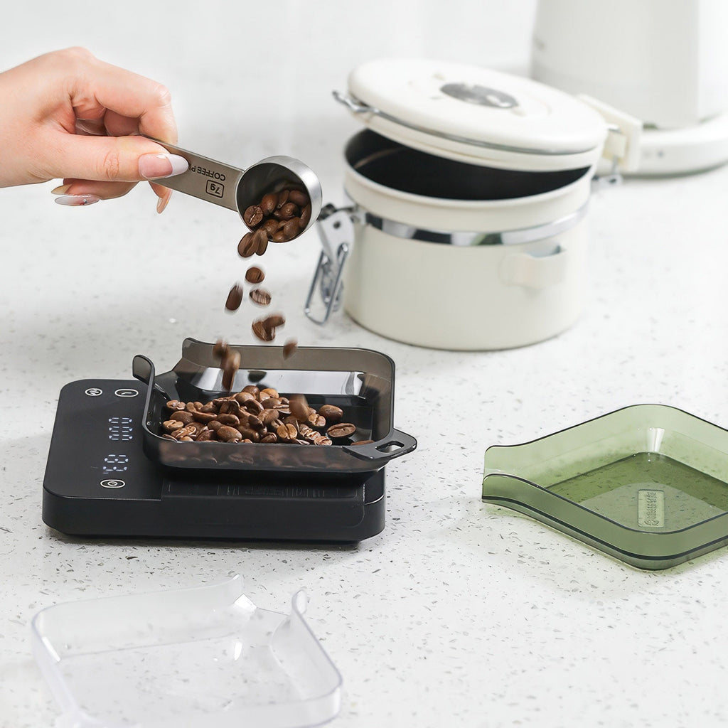 Absolutely! The square-bottom profile is designed to maximize contact with standard coffee scales. The flat base and four-corner stability keep it planted and level, so your weight readings stay accurate without wobble. It pairs well with popular models from Acaia, Timemore, and other common brewing scales. Just make sure your scale platform is at least as wide as the tray base for the best results.