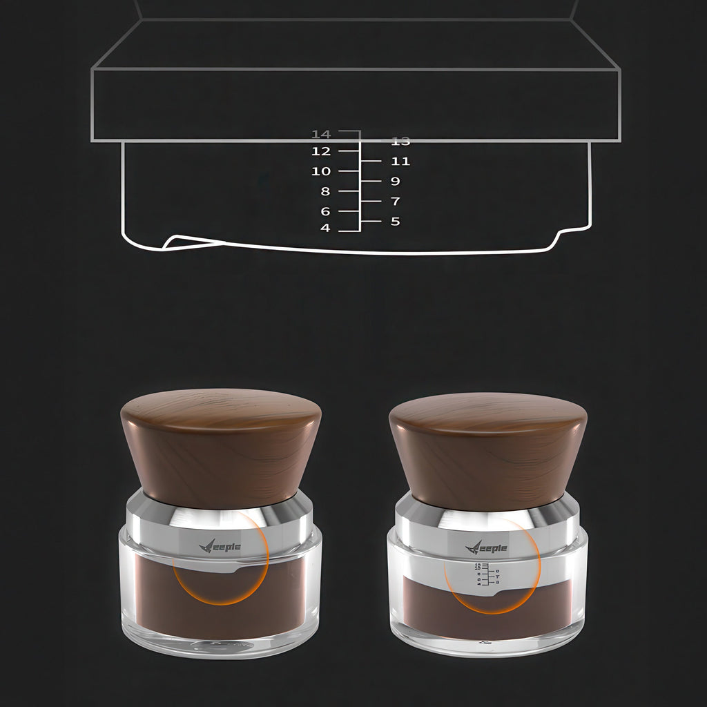 It is straightforward. The side of the tool has engraved scaling marks from 4 to 14 mm (approx. 0.16 to 0.55 in). Simply twist to raise or lower the distribution prongs until you reach the depth that matches your dose and basket. Once dialed in, it stays locked at your setting so you get repeatable results every single pull without re-adjusting.