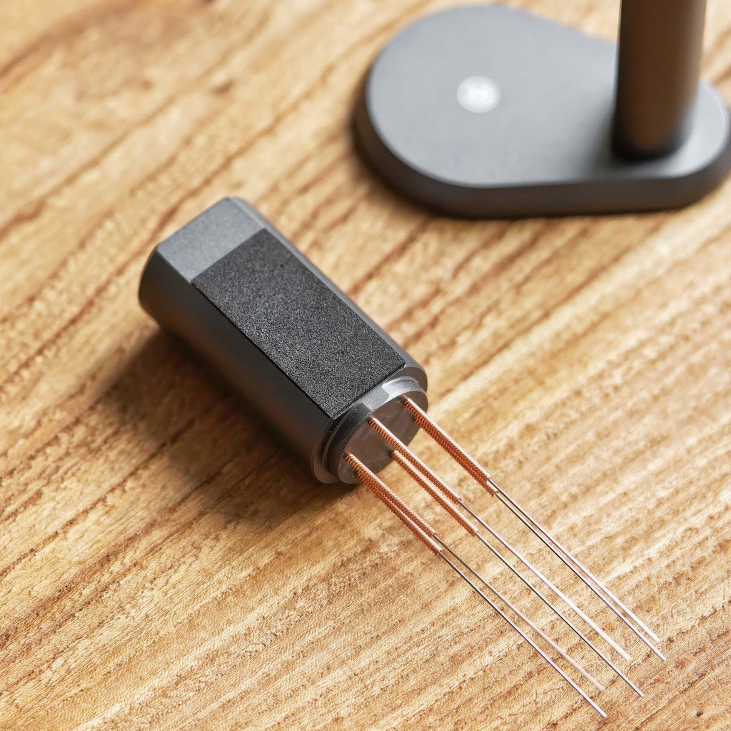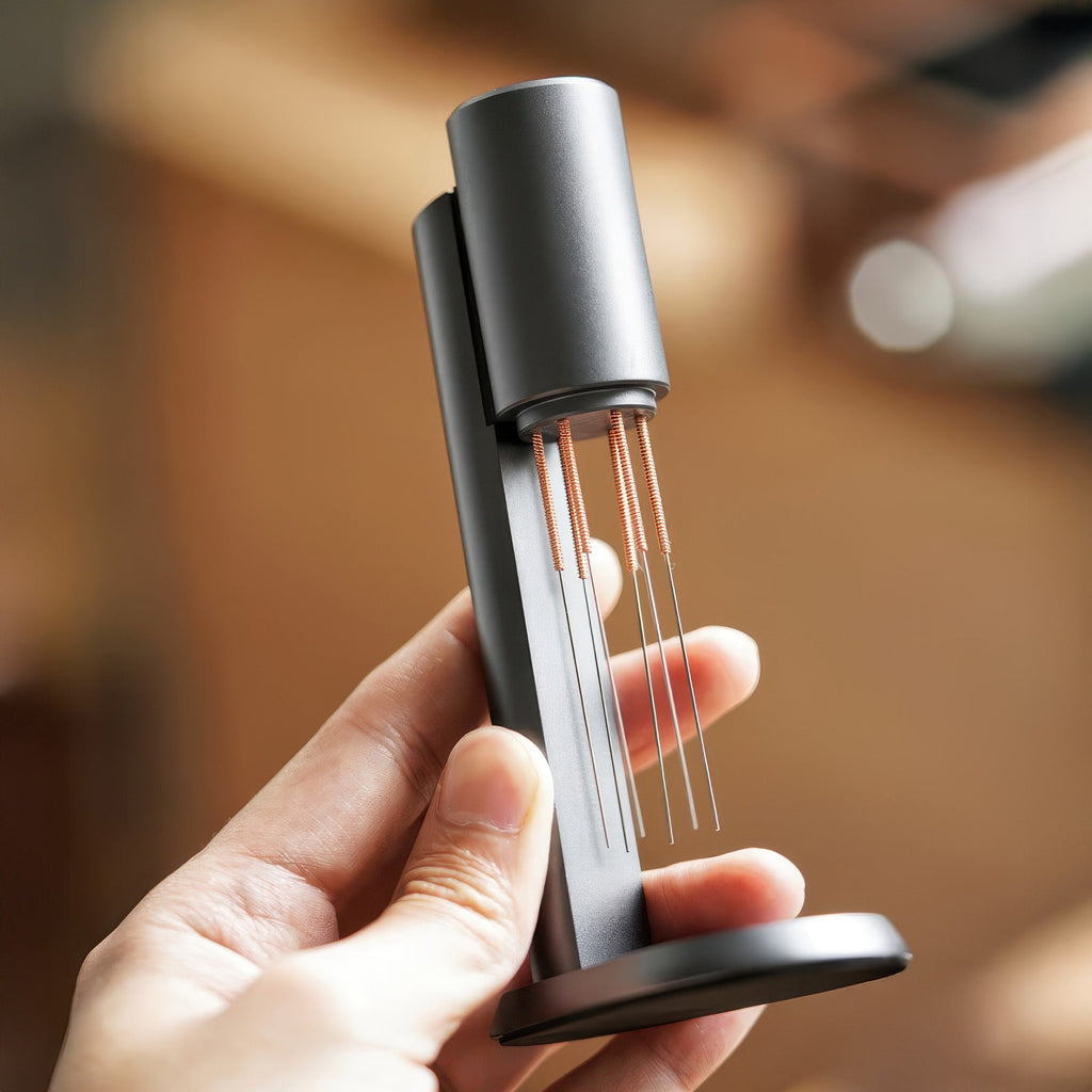 Caring for your tool is simple. After each use, give the needles a quick rinse under warm water or tap them gently to remove any stuck grounds. Wipe the aluminum body with a dry or slightly damp cloth. Avoid submerging the magnetic stand in water. Always store it upright on the included magnetic stand to protect the needle tips from bending and keep your station tidy.