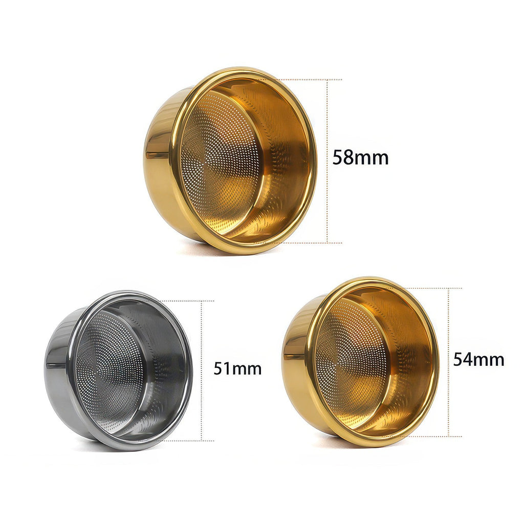 Absolutely. This basket is crafted from 304 food-grade stainless steel, one of the most trusted materials in commercial food equipment. It offers excellent resistance to corrosion and oxidation, meaning it holds up beautifully even with daily use and regular backflushing. The titanium gold finish option is also fully food-safe, applied as a coating over the same high-quality stainless steel base.