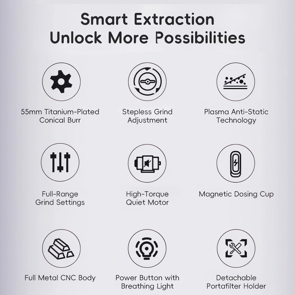 It genuinely makes a difference. The plasma anti-static technology neutralizes electrical charge generated during grinding, which is the main cause of grounds clinging to the chute, cup, and your countertop. Combined with the magnetic dosing cup and gravity-fed dispersion system, grounds drop cleanly and retention stays minimal. You will notice far less cleanup compared to grinders without active static management.