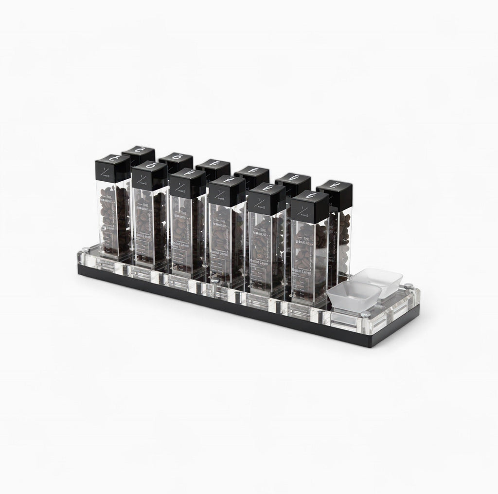 It depends on how many different beans you rotate and how far ahead you like to dose. The 6-tube set is perfect if you pull one or two shots a day and buy beans in smaller batches. The 12-tube set works well for households with multiple coffee drinkers, or if you enjoy comparing several origins side by side throughout the week. Both sets include the stand and funnel.