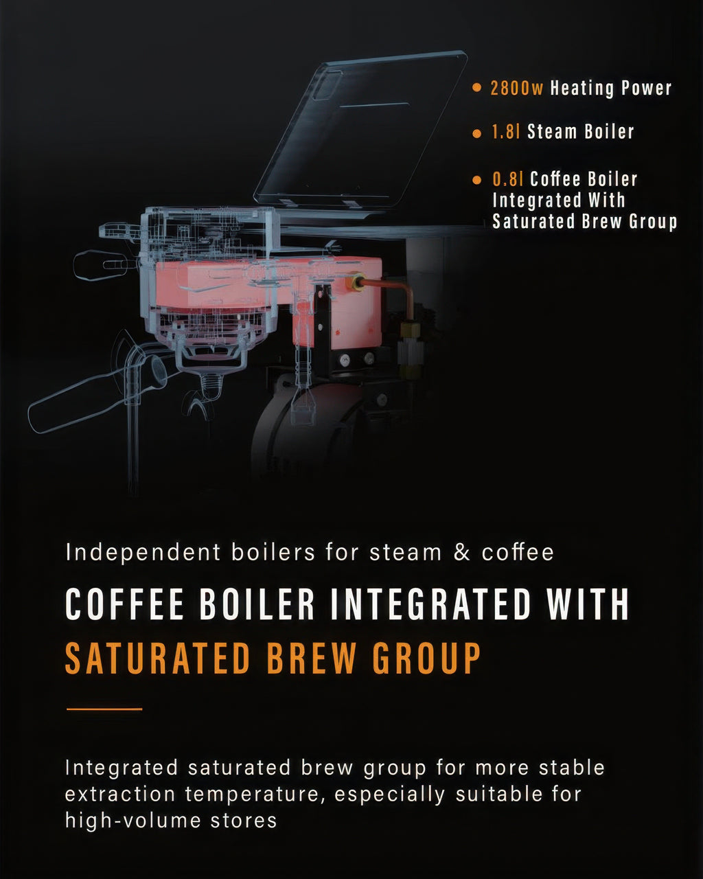 Great question! The dual boiler design gives you two independent stainless steel boilers: a 1.8L steam boiler and a 0.8L brew boiler. This means you can brew espresso and steam milk at the same time without any temperature compromise. Unlike single boiler machines that require you to wait and purge between tasks, or heat exchangers that can fluctuate, dual boilers maintain rock-solid thermal stability for consistently excellent extractions.